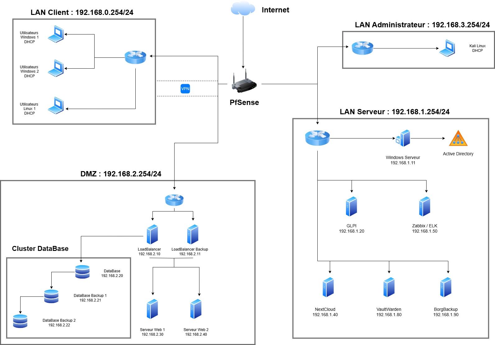 Conception et déploiement d'une infrastructure réseau complète avec Active Directory, serveur de fichiers et gestion centralisée des utilisateurs et ressources.